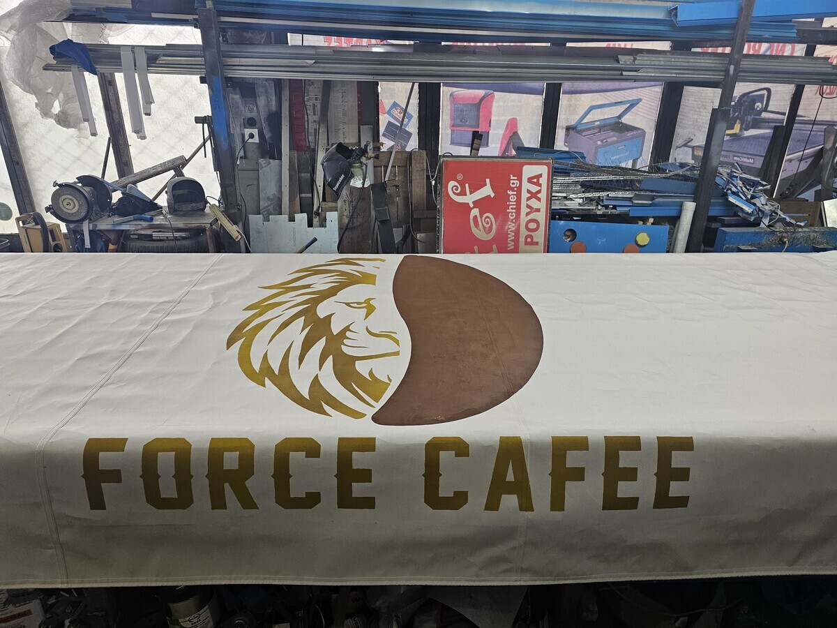 Στο πλαίσιο των Επιγραφών Τεντών, η Επιγραφές Άρης ανέλαβε την Κατασκευή εκτύπωσης λογότυπου (λιοντάρι) και "Force Cafe" σε μουσαμά στην Αθήνα. Η ψηφιακή εκτύπωση μεγάλου format σε μουσαμά είναι η ιδανική λύση για τέντες και καλύμματα, προσφέροντας αντοχή και ζωντανά χρώματα. Το έργο αυτό εξασφάλισε τη μέγιστη προβολή του λογοτύπου "Force Cafe" και του γραφικού του λιονταριού, με την εγγύηση ποιότητας της Επιγραφές Άρης.